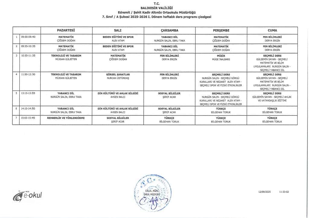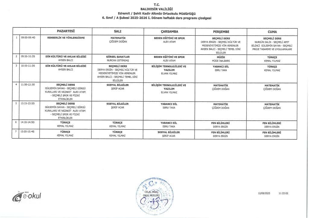 2025-2026 Eğitim Öğretim yılına ait şube ders programları aşağıda yer almaktadır.