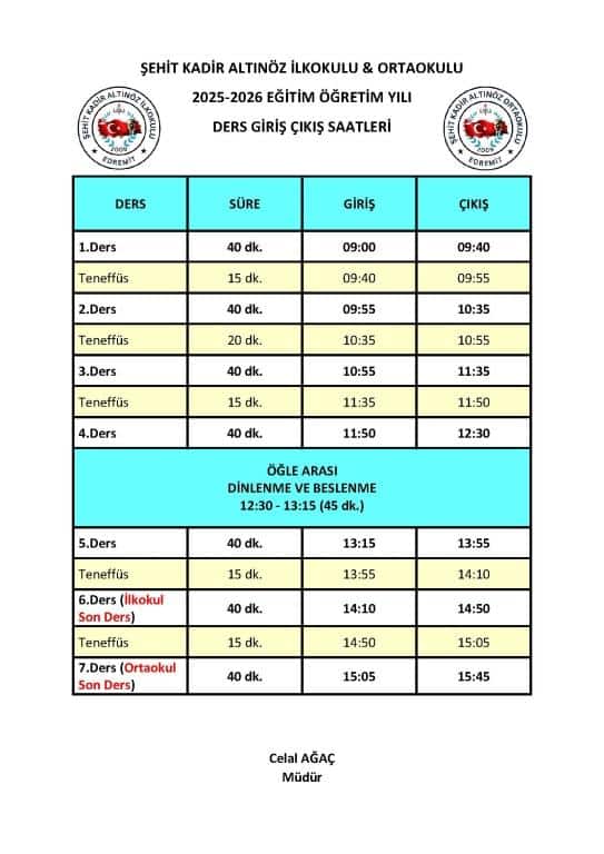 Okulumuza ait 2025-2026 eğitim öğretim yılı ders giriş ve çıkış saatleri aşağıdaki gibidir. Bütün öğretmen, öğrenci ve velilerimize başarılı bir eğitim - öğretim yılı geçirmesini dileriz.